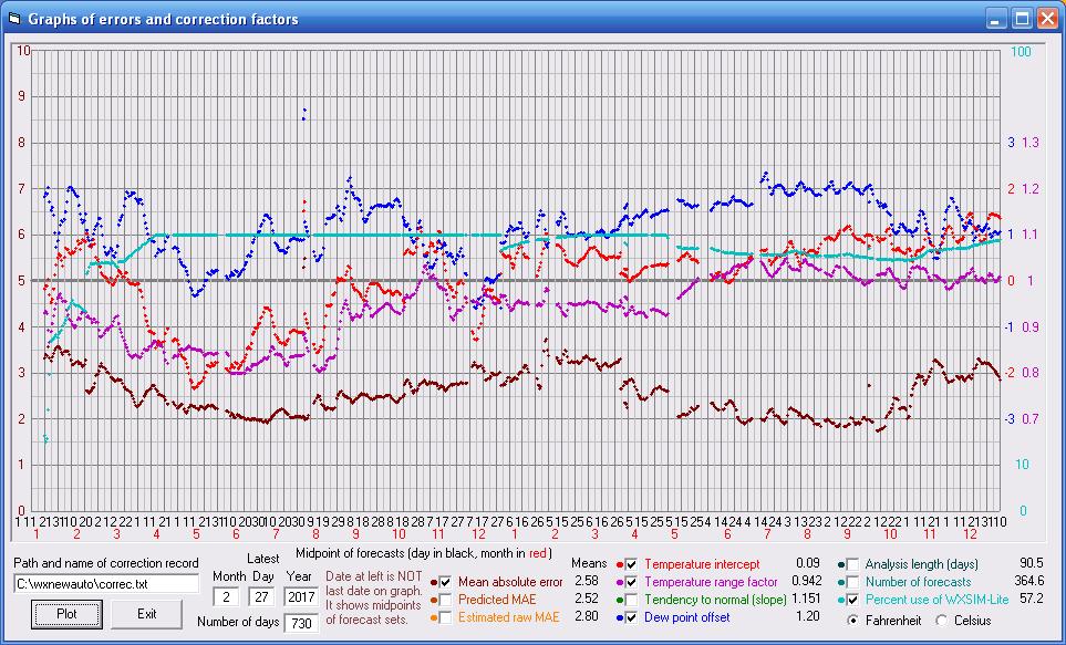 Here is a graphical display of two years of data from correc.txt. There is a slight improvement over time, as autolearn (via wret.exe) accumulated data, WXSIM-Lite was added to the mix, and improvements were made in the system. You can also see seasonal variations, with summer mean absolute errors smaller than those in winter: