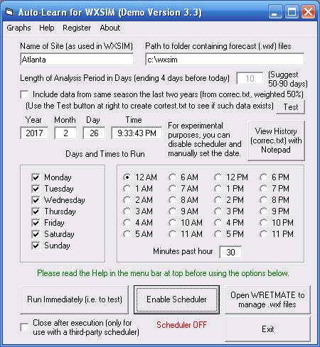 Since this is, for technical reasons, a separate program, and since I have not charged any kind of upgrade fee for WXSIM or its companion programs (wret.exe and wxsimate.exe) over 10 years, I decided to make this (very optional) accessory a separate registration and purchase. I am including it in a fairly functional demo mode as part of the basic WXSIM package - "fairly" functional in the sense that it definitely works, but the analysis period is limited to only 10 days, which is really too short for optimal results, except in particularly "boring" climates. I don't think running in this demo mode will "blow" the forecasts, but users concerned about optimal accuracy should still do the Auto Select process manually using longer time periods, or register AutoLearn-WX, using the same Downloads page where downloads and purchases can be made.