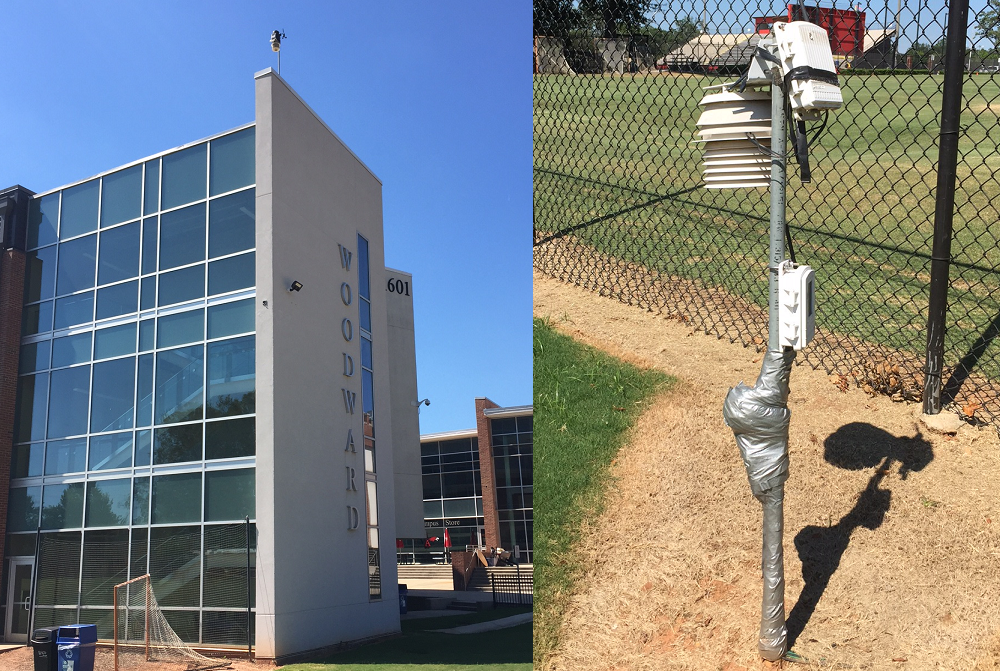 Woodward Academy's weather data is collected by a Davis Vantage Pro 2 instrument package mounted on the roof of the Science and Math Building at Woodward Academy in College Park, Georgia. The wind instruments are located about 6 feet (2 meters) above the southeast corner of the roof, about 50 feet (15 meters) above the ground. Due to local obstructions (including a tree about 60 feet to the east), wind speeds are slightly less than measured at KATL (Hartsfield-Jackson International Airport) a bit less than 3 miles to the south. An additional temperature and humidity sensor is in a solar radiation shield (fan aspirated, as is the main station), about 4 feet (1.25 meters) above the ground. Data are uploaded every 15 minutes. Both thermometers are in fan aspirated radiation shields. The second (4 foot AGL) sensor reads only to whole Fahrenheit degrees, while the main one registers tenths. Soil temperatures are recorded at 4 depths: 2, 4, 8, and 20 inches.