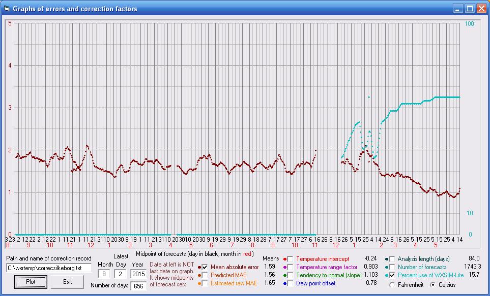 Here is an example (the best of several I looked at) made using autolearn.exe, of how WXSIM-Lite gradually improved forecast accuracy for a user in Denmark. Mean absolute error (here in Celsius degrees) had been hovering around 1.7 degrees for about 18 months, and then dropped to abuot 1 degree within a couple of months as WXSIM-Lite came got a larger learning base and as the data set contained more and more of these forecasts with WXSIM-Lite mixed in at 65%.