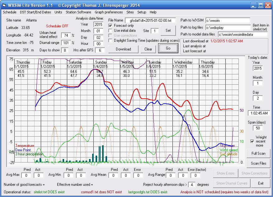 WXSIM-Lite (the official name of wxsimlite.exe) was inspired by two main things: (1) the success of Autolearn-WX in reducing bias and improving WXSIM forecasts, and (2) the frustrating barriers to further improvement once systematic errors had been greatly reduced. Government and commercial forecast products have been improving over the years, especially in increasing geographical specificity, temporal resolution, and range of forecast details - all of these formerly relative strengths of WXSIM. For many users, some of these other products were doing better than WXSIM, after all the effort I'd put into it!