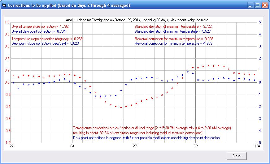 I started testing such a system in late 2013, on over a dozen sites (in most cases using data from customers) and continued through much of 2014. The bias correction techniques overlap with those in autolearn.exe, but also include corrections specific to each half-hour of the day. More details on this appear in the Help section of WXSIM-Lite, but briefly, among the many things accounted for are the exact minute of sunrise, the degree of urbanization of the site, and the amount of short-term variablity (minute-by-minute) in the site's temperatures.