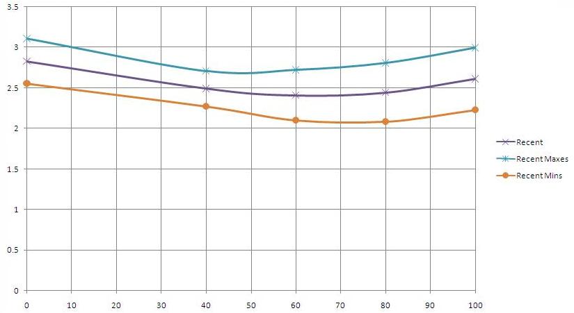 I've found that, indeed, such a mixture can produce results superior to either alone, especially in the case of nighttime temperatures, where WXSIM seems to have a somewhat 'original' opinion. In October, 2014, I began testing parallel runs at 0, 50, 80, and 100% WXSIM-Lite weighting, then in January, 2015 branched this into five runs (0, 40, 60, 80, and 100%). The mean absolute errors (in Fahrenheit degrees) for daily maximum, minimum, and mean temperatures, days 2 through 4 combined, for the January, 2015 through January, 2017 runs - representing 2306 time and data matched forecasts using each percentage - are shown below, plotting against percent WXSIM-Lite mixed in: